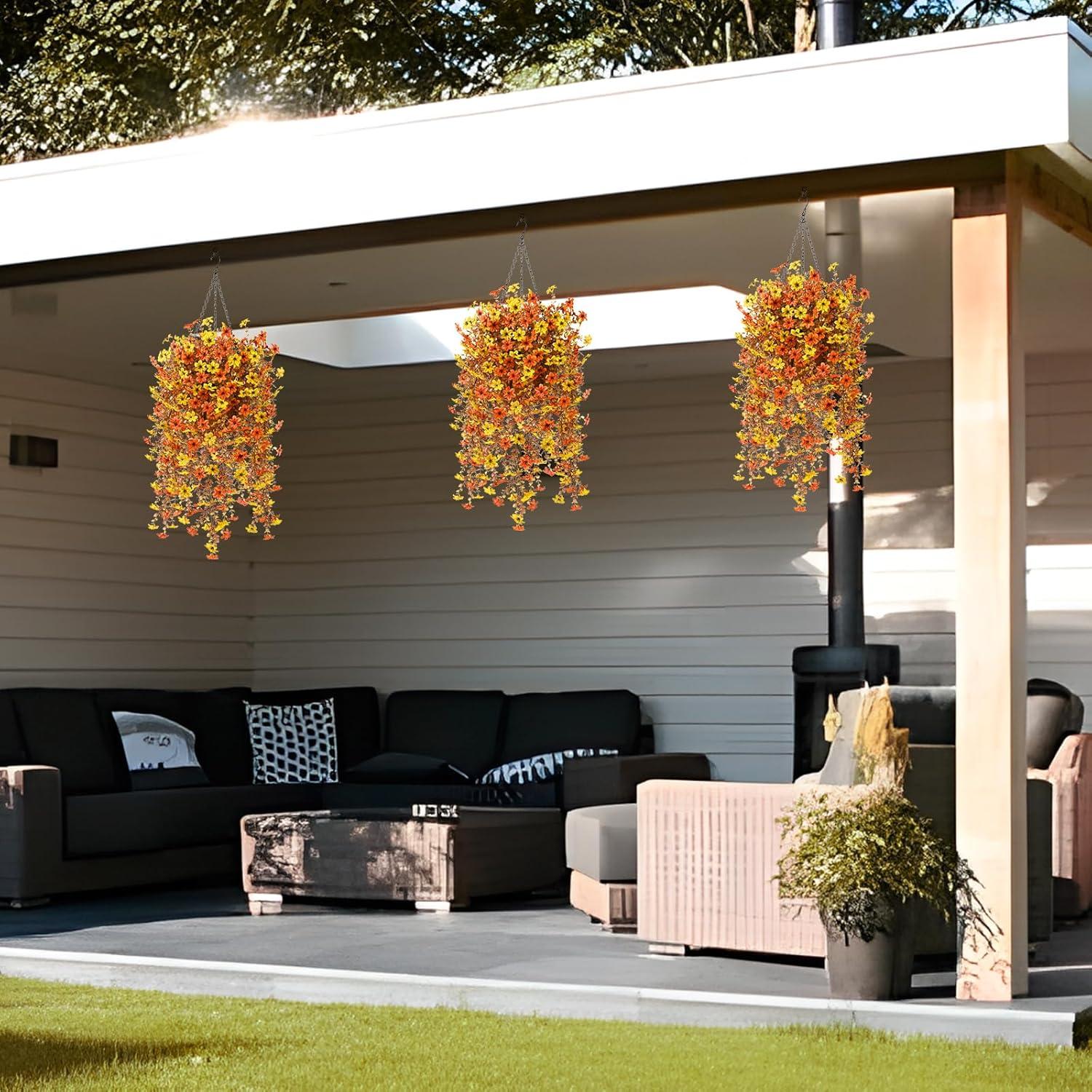 Artificial Fake Hanging Flowers Plants for Outdoor Spring Decoration, 2 PCS Faux Silk Daisy Flower UV Resistant Look Real for Outside Patio Porch Garden Balcony Yard Home Summer Decor(Perple Blue)(C Orange Yellow)