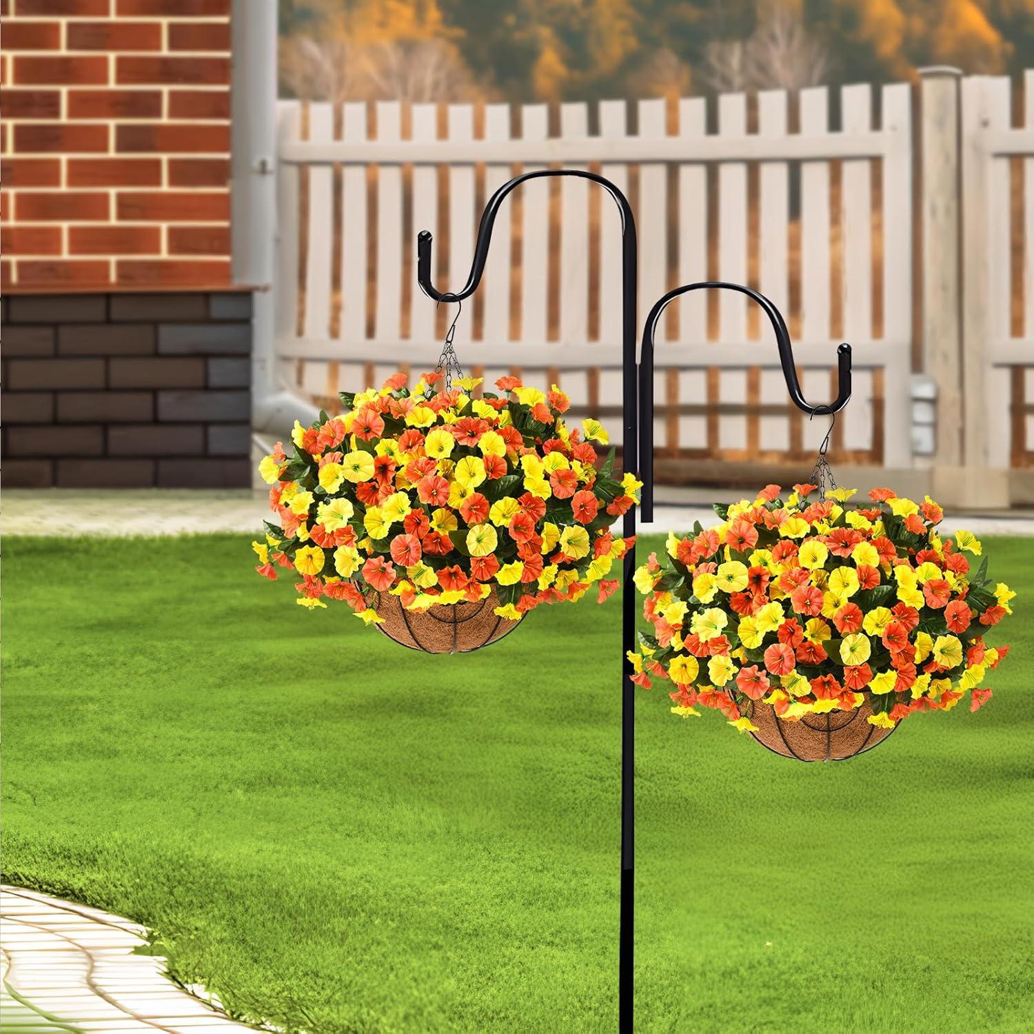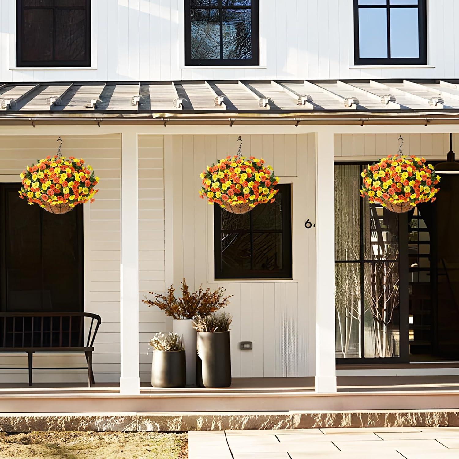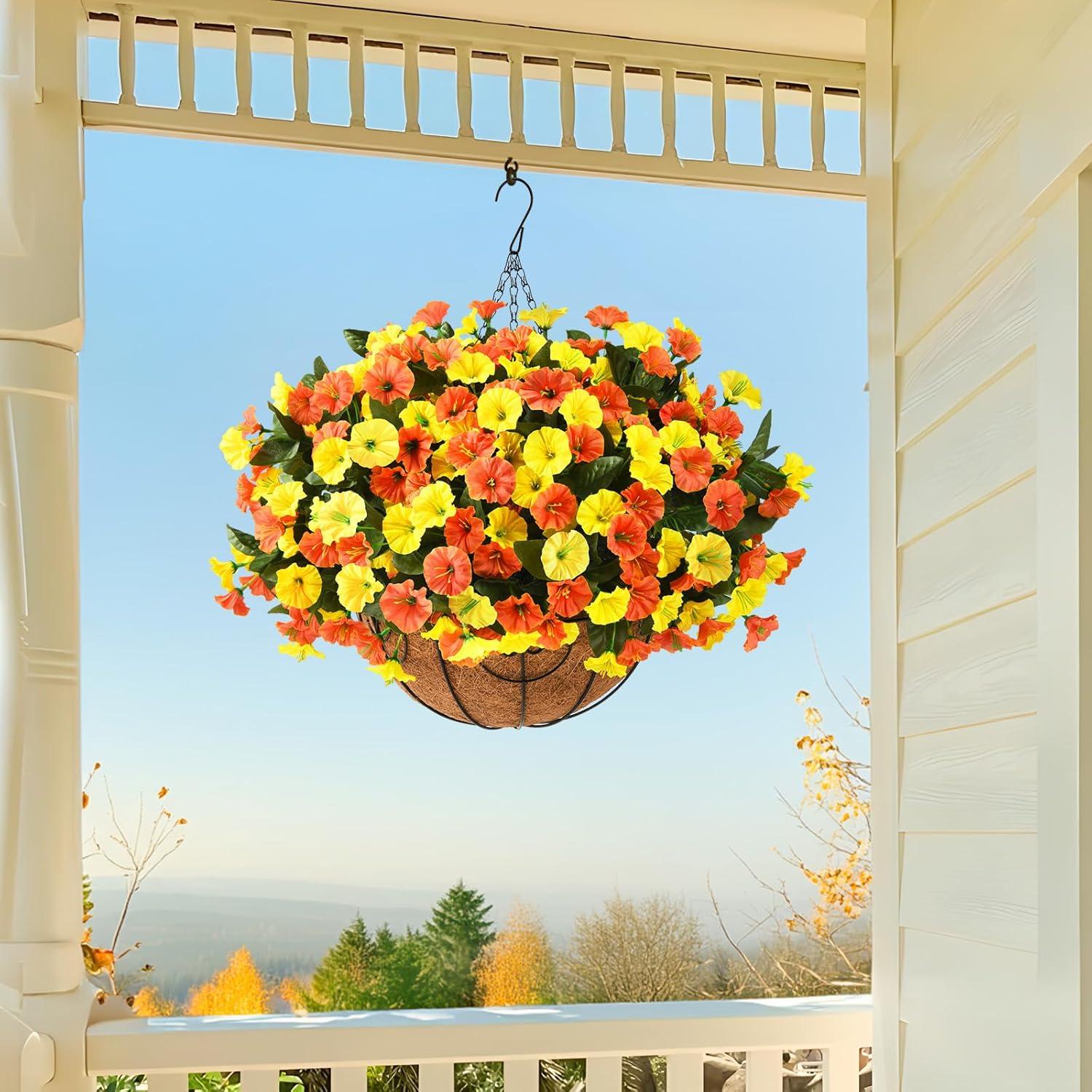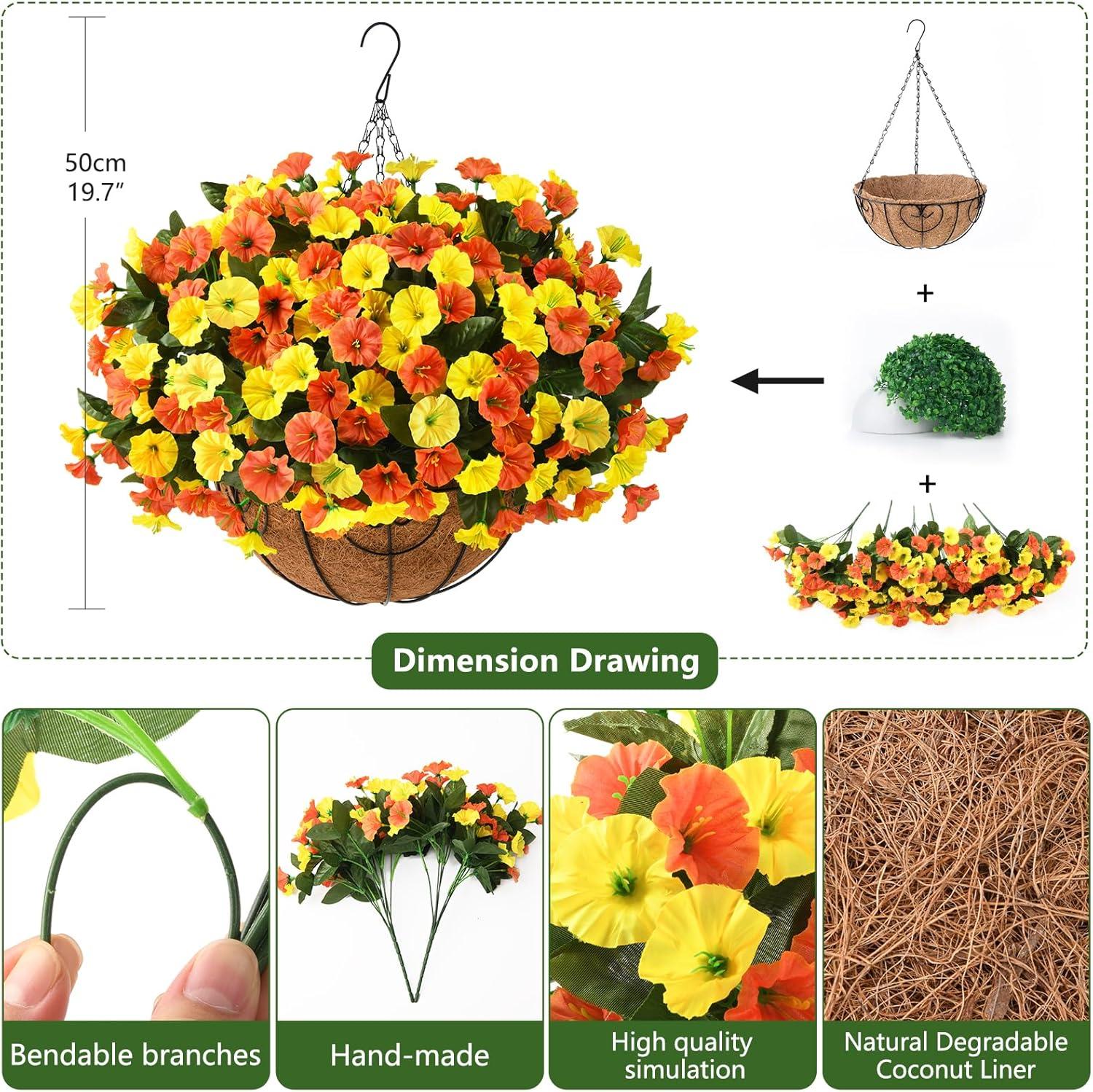 Artificial Fake Hanging Flowers with Basket for Outdoors, Faux Silk Petunias Flower Spring Summer Decor UV Resistant Look Real for Home Outside Patio Front Porch Decorations(Orange Yellow)