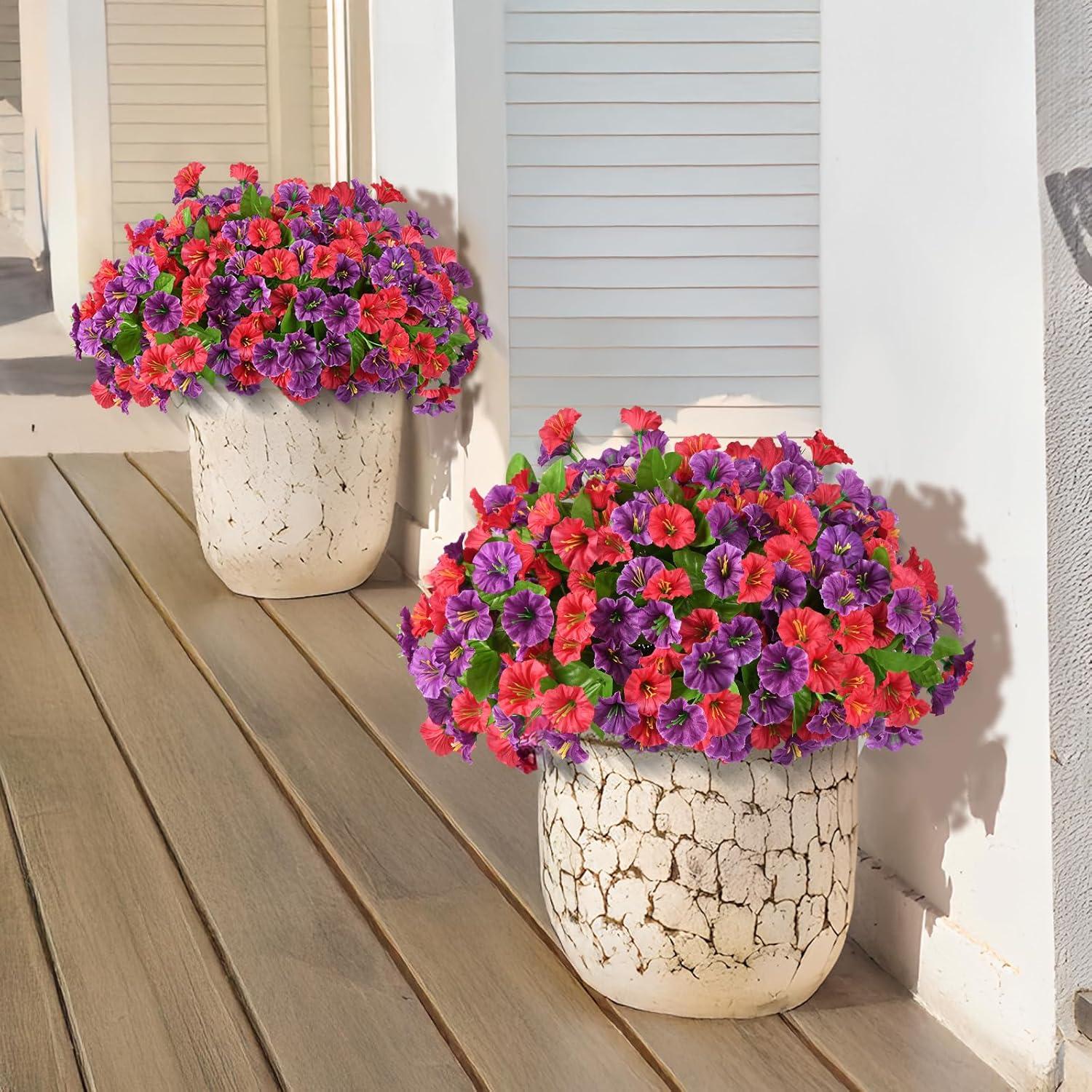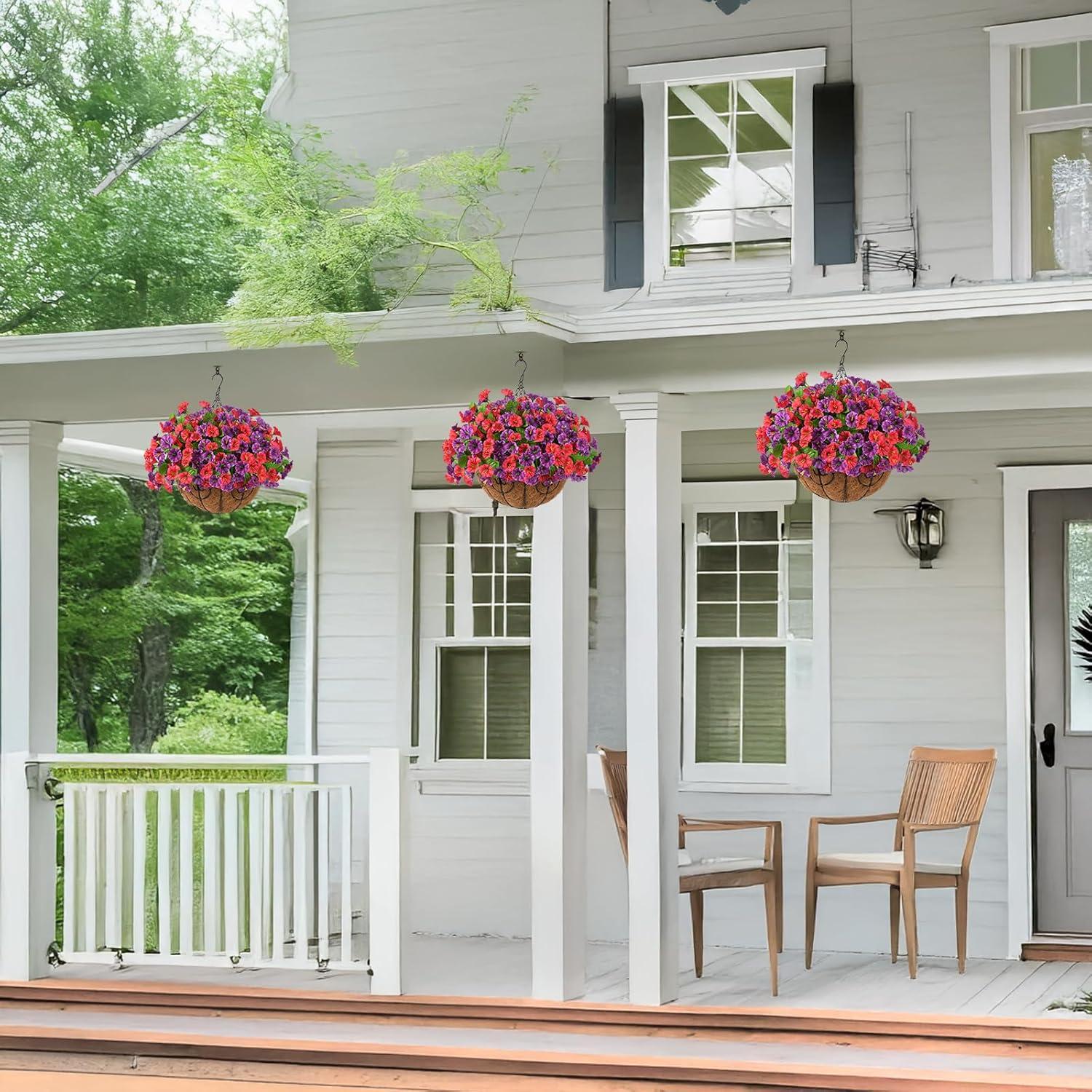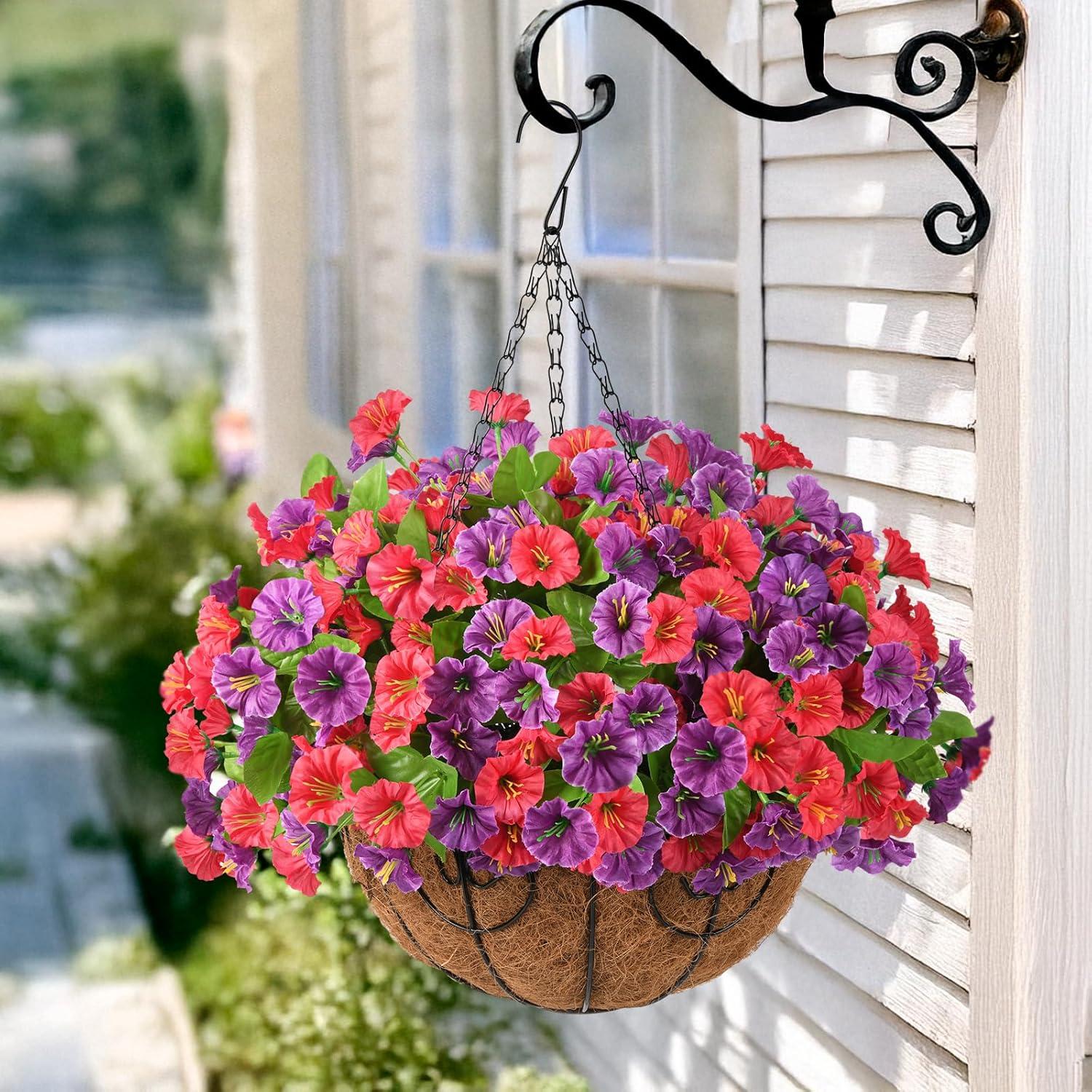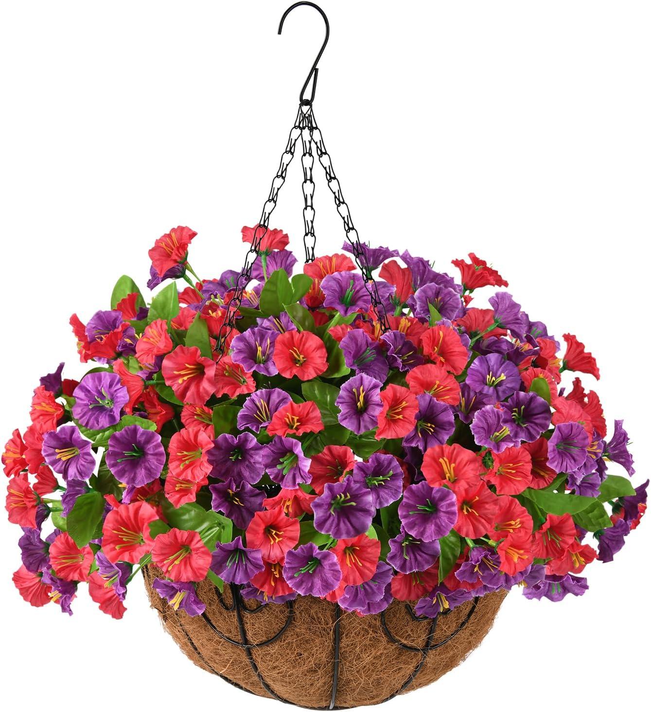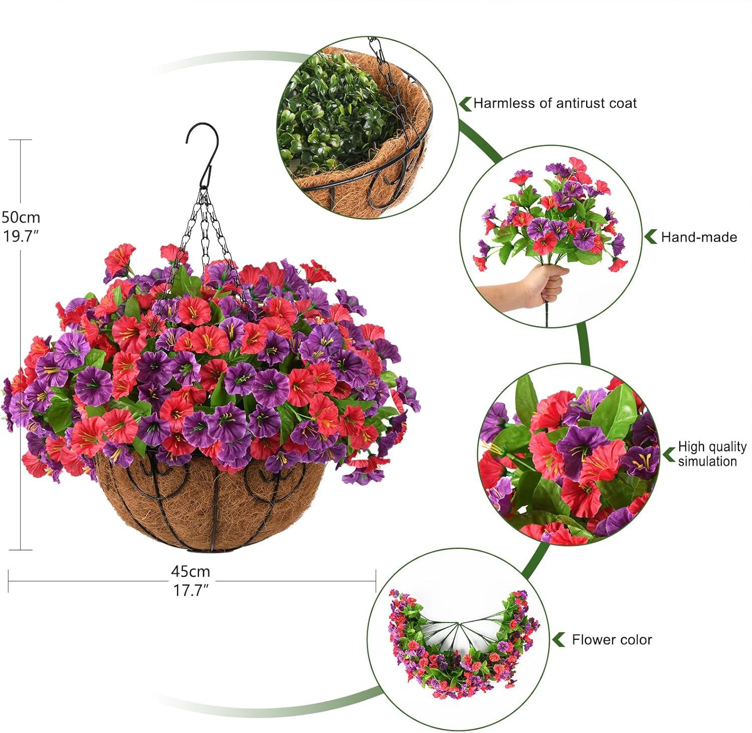 Artificial Fake Hanging Flowers with Basket for Outdoors, Faux Silk Petunias Flower Spring Summer Decor UV Resistant Look Real for Home Outside Patio Front Porch Decorations(Red Purple)