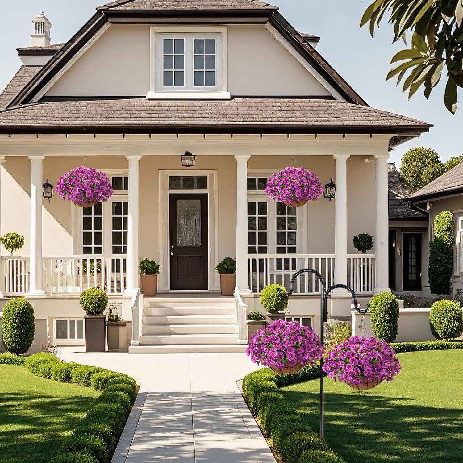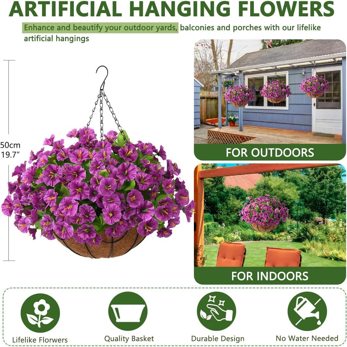 Artificial Fake Hanging Flowers with Basket for Outdoors, Faux Silk Petunias Flower Spring Summer Decor UV Resistant Look Real for Home Outside Patio Front Porch Decorations(Z Purple)