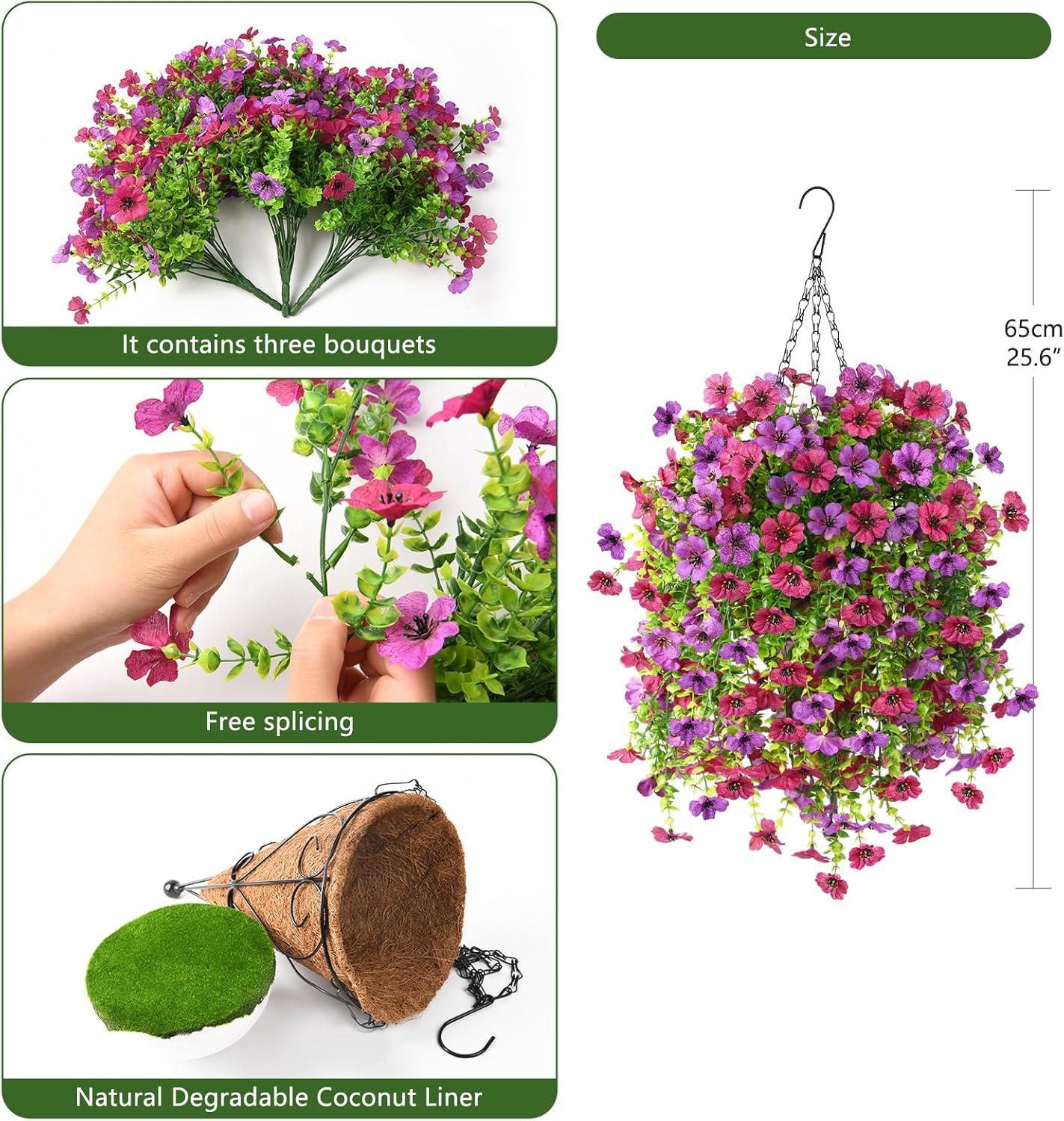 Faux Hanging Flowers for Outdoor:The fake flowers comprise of high-quality silk material flowers and plastic eucalyptus leaves.Each bouquet which can be adjusted flexibly.Fresh color, generous and elegant,well made and vibrantly colored, looks real to blow your neighbors away