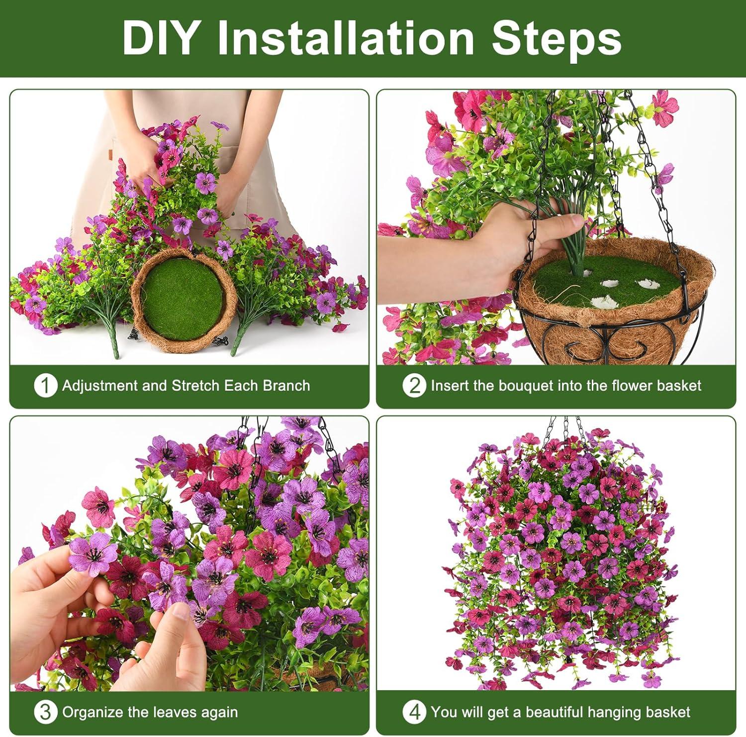 Simple Assembly Artificial Hanging Flowers:The fake hanging plants can be DIY according to your needs,or refer to the pictures listed above to assemble. Please follow the stepe in product details and just a few minutes of assembly,you will get a beautiful hanging flowers basket