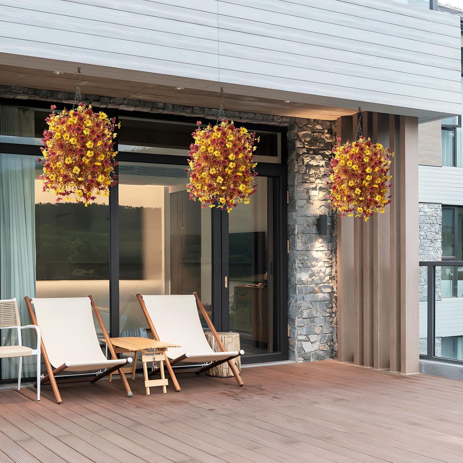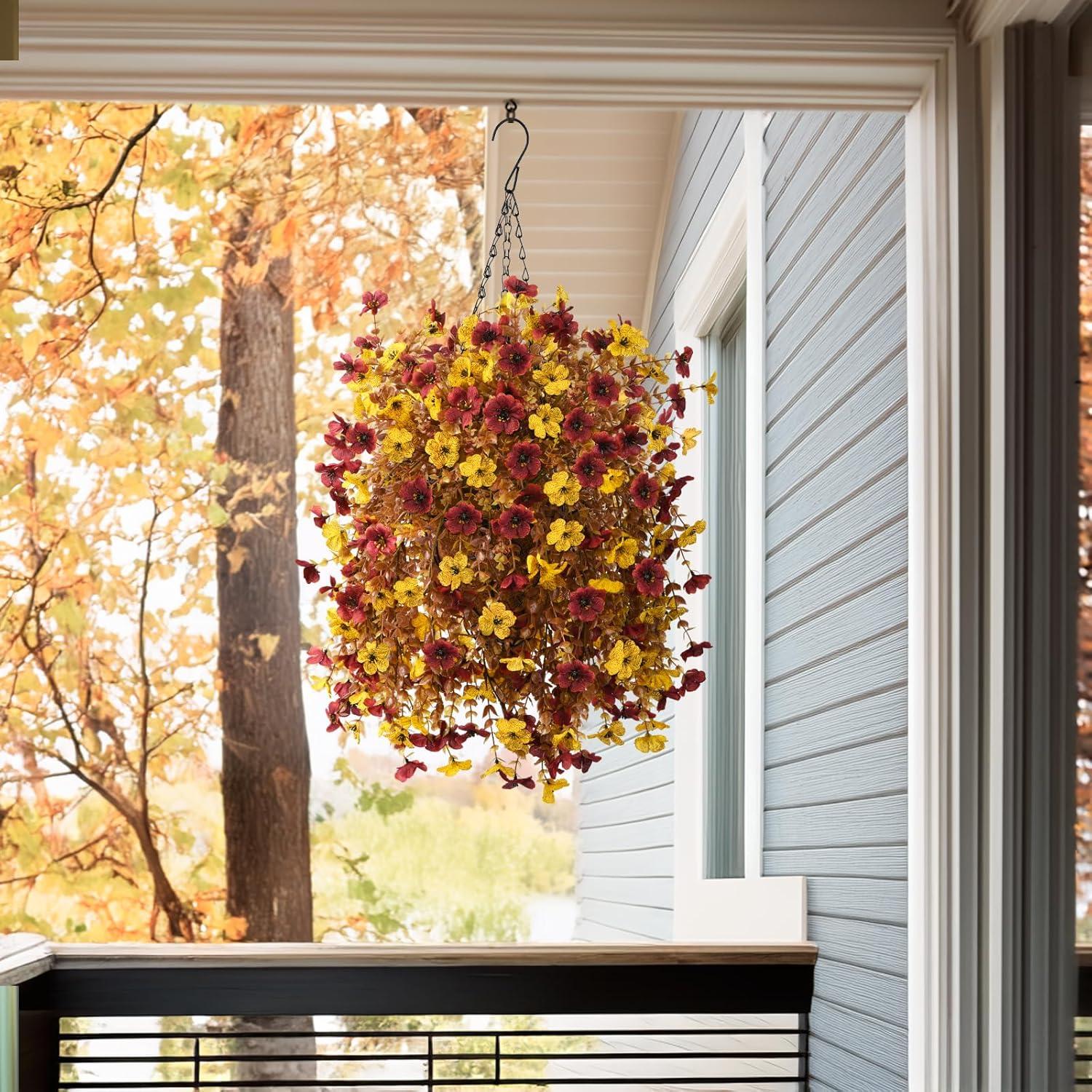 Artificial Fake Hanging Plants Flowers Baskets for Outdoor Outside Spring Decor,Faux Silk Daisy UV Resistant Look Real Summer Decorations for Home Porch Patio Yard Garden(Red(Yellow Brown)