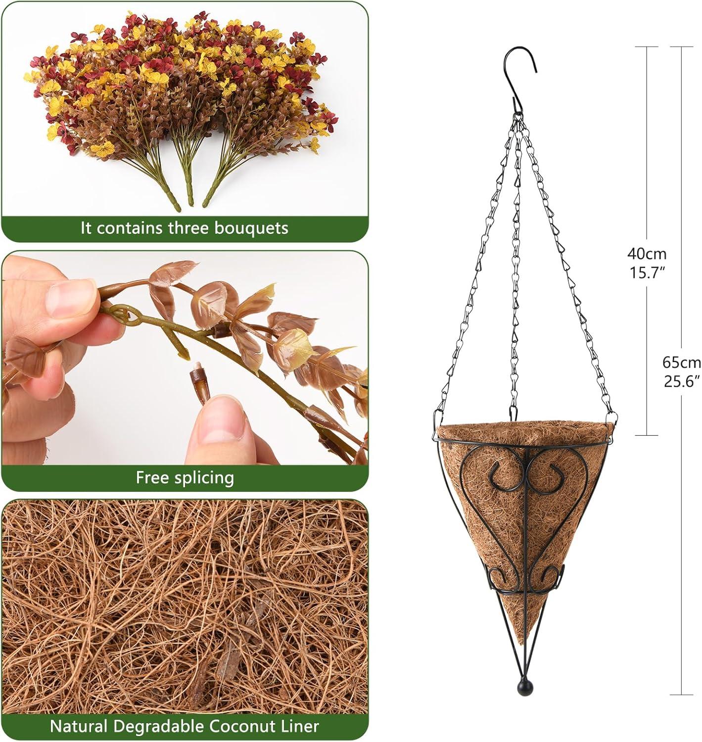 Beautiful Faux Hanging Flowers :The colorful fake hanging flowers is include of 3 branches fake daisy flowers,and a coconut palm lining metal chain hanging flowers basket.Each hanging branch has vivid outdoor artificial flowers