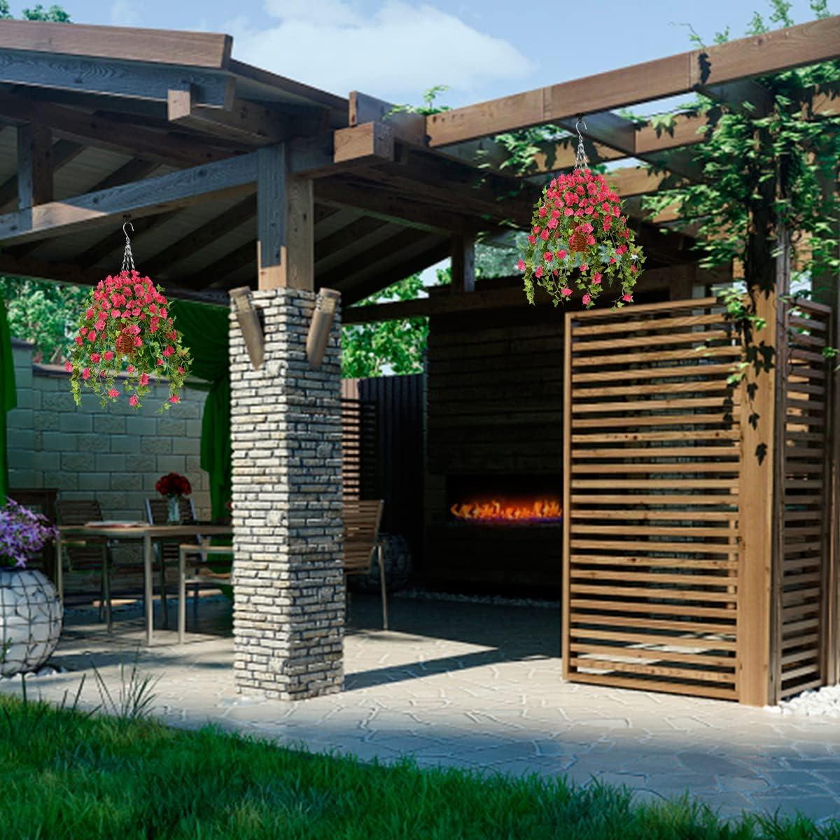 Hanging Basket with Artificial Vine Fake Silk Flowers Plants for Outdoor Indoor, Coconut Lining Basket for Patio Lawn Garden Porch Home Spring Decor (Red)(Red)