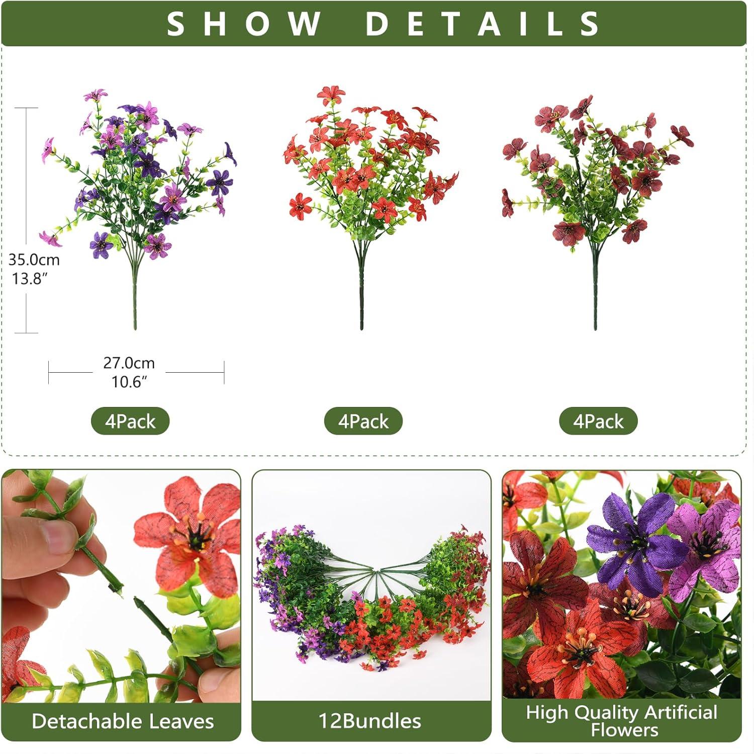 12 Bundles Fake Flowers: Package includes 12 bundles fake flowers(Dark purpl&Light purple*4, Red*4, Brown*4). Each artificial fall flowers measures 12.2″ (L) x 6.3″ (W). the colorful artificial mums for outdoors have removable silk flowers and stem, can make stunning arrangements and bouquets, make DIY easier and funny