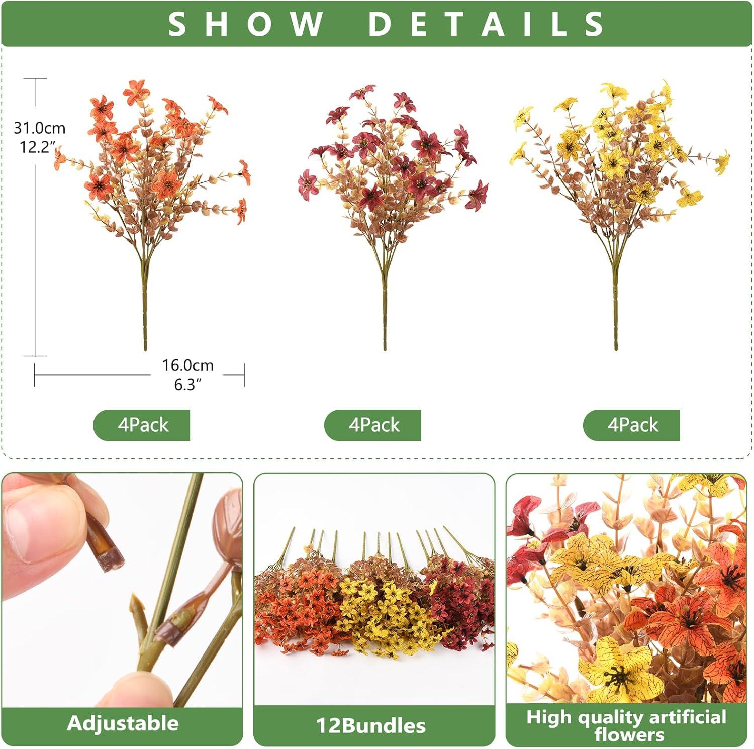 12 Bundles Fake Flowers: Package includes 12 bundles fake flowers(Dark purpl&Light purple*4, Red*4, Brown*4). Each artificial fall flowers measures 12.2″ (L) x 6.3″ (W). the colorful artificial mums for outdoors have removable silk flowers and stem, can make stunning arrangements and bouquets, make DIY easier and funny
