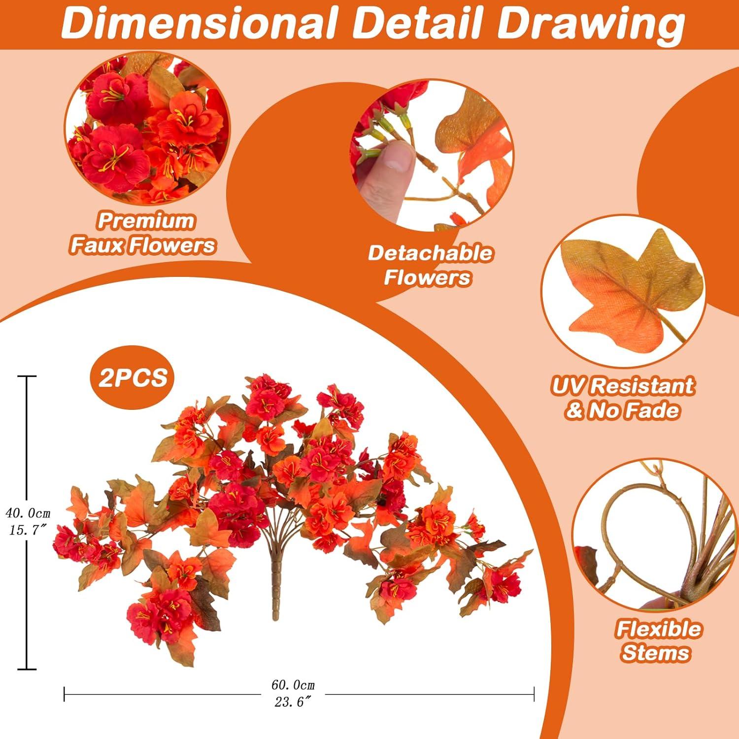 Homsunny Fall Flowers for Outdoors, 2 PCS Fake Fall Flowers UV Resistant Fake Autumn Artificial Flowers for Porch Patio Window Box Planter Home Decor (Sunset Red and Orange)(Double Orange)